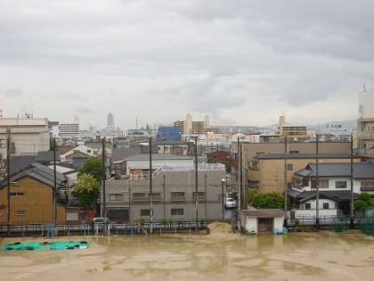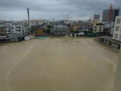 6月4日(金)朝からしっかり雨が降っています。梅雨本番。運動場も水浸し。空も厚い雲が覆っています。