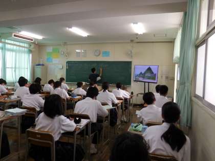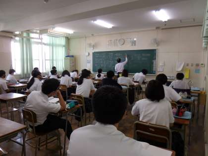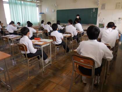 6月7日(月)6限目の様子です。外はかなり暑くなってきています。教室はまだ風が吹き抜けています。左から1年生社会、2年生国語、3年生数学の様子です。