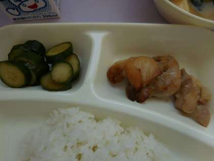 6月10日(木)の給食は鶏肉のしょうゆバター焼き、こまつなのみそ汁、きゅうりのあえもの、ごはん、牛乳です。鶏肉のしょうゆバター焼きは鶏肉に濃い口しょうゆとバターで味付けしています。こまつなのみそ汁はとうふ、じゃがいも、たまねぎ、こまつなにんじんが入っています。きゅうりのあえものはあっさり味です。おいしかったです。ごちそうさまでした。