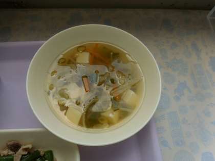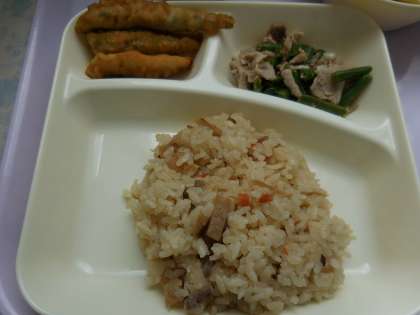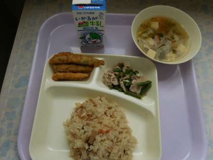 6月14日(月)の給食はいわしのてんぷら、五目汁、豚肉とさんどまめのいためもの、炊き込みご飯、牛乳です。いわしのてんぷらはなたね油でからっと揚がっています。五目汁はとうふ、キャベツ、たまねぎ、にんじん、青ネギ、が入っています。豚肉とさんどまめのいためものは豚肉とさんどまめを綿実油でいためています。きょうは炊き込みご飯、おいしかったです。ごちそうさまでした。