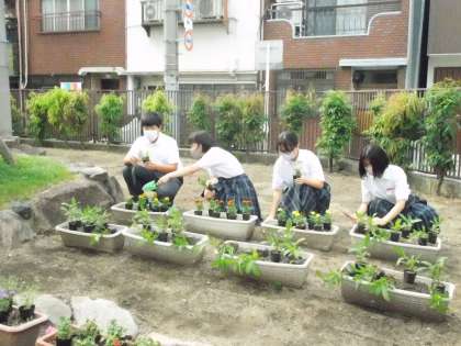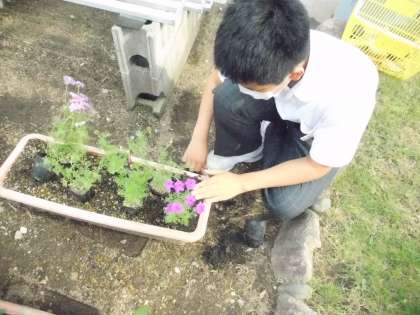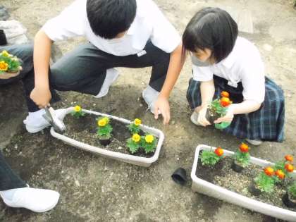 6月16日(火)昨日、生徒会のみなさんが玄関のプランターにきれいな花を植えてくれました。一つ一つ丁寧に植えてくれています。