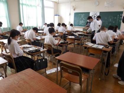 7月2日(金)2年生は書写の授業です。「栄光」頑張って筆を走らせています。