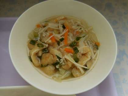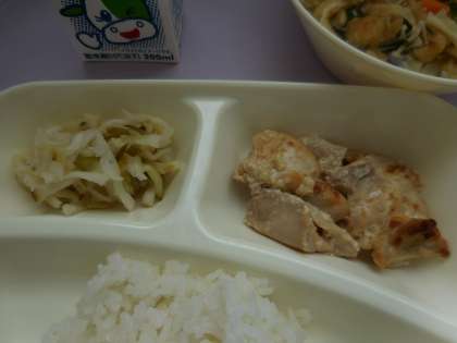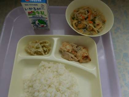 7月5日(月)の給食は鶏肉のしょうゆマヨネーズ焼き、五目汁、切り干し大根のゆずの香あえ、ごはん、牛乳です。鶏肉のしょうゆマヨネーズ焼きは鶏肉にしょうゆとマヨネーズで味をつけて焼いています。五目汁はうすあげ、たまねぎ、キャベツ、にんじん、青ネギ、エノキタケが入っています。切り干し大根のゆずの香あえは切り干し大根ときゅうりにあっさり味でゆずの香りがします。おいしかったです。ごちそうさまでした。