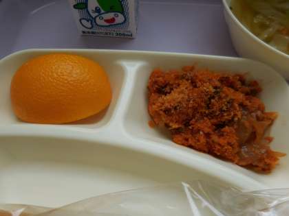7月7日(水)の給食はかぼちゃのミートグラタン、スープ、オレンジ、パン、牛乳です。かぼちゃのミートグラタンは牛豚ひき肉、かぼちゃ、たまねぎ、にんにくが入ってこんがり焼けています。スープは鶏肉、キャベツ、にんじん、コーン、パセリ、が入っています。おいしかったです。ごちそうさまでした。