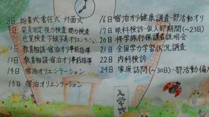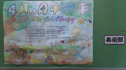 美術部による4月行事予定表を中央階段の掲示板に貼りました。中央に、新入生に向けての「入学おめでとうございます」の文字が躍っています。