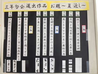 7月最後の授業で、各クラスとも句会を行いました。各自が作った創作俳句を名前が載っていない状態で一覧にして、その中から気に入った俳句を一人三句選び、次々と発表していきました。選者が自分の選んだ番号を読み上げると選ばれた番号の人が「はい」と手を挙げる形でしたので、読み上げるたびに、どよめきや拍手が起こり、非常になごやかな雰囲気の中で句会が進行していきました。各クラスで多くの票を集めた句を紹介します。