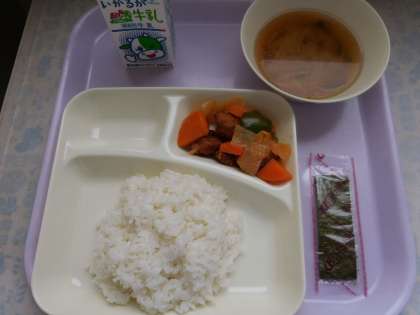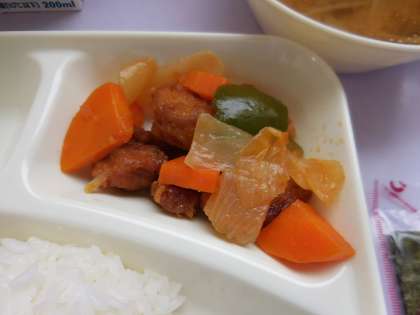9月3日(金)の給食は酢豚、中華スープ、焼きのり、ごはん、牛乳です。酢豚は豚肉、しょうが、たまねぎ、たけのこ、にんじん、ピーマンが入っています。中華スープは鶏肉、ブラックマッペもやし、コーン、にら、しいたけがはいって赤みそ、中華スープで味付けしています。おいしかったです。ごちそうさまでした。