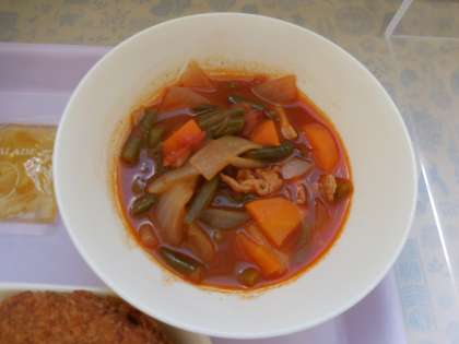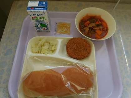 9月6日(月)の給食はチキンレバーカツ、ケチャップ煮、キャベツのバジル風味サラダ、パン、牛乳です。ケチャップ煮は豚肉、ジャガイモ、たまねぎ、にんじん、さんどまめ、トマト缶が入っていてとんかつソースやケチャップで味付けしています。キャベツのバジル風味サラダはワインビネガーや薄口しょうゆで味付けしています。おいしかったです。ごちそうさまでした。