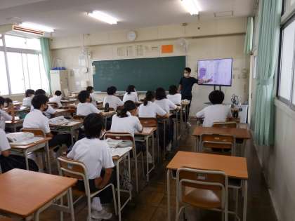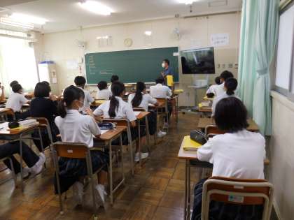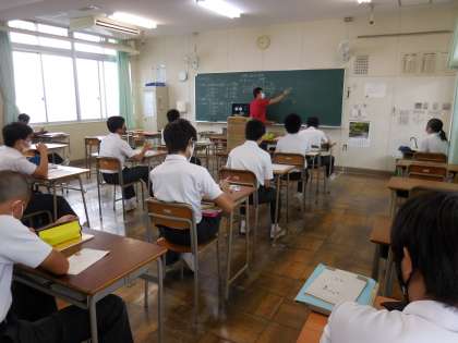 9月8日(水)各学年の授業中の様子です。上から3年生の理科、天体について学習しています。2年生数学、関数の学習をしています。1年生社会の歴史、奈良時代の人々の暮らしについて学習しています。みんな一所懸命、がんばっています。
