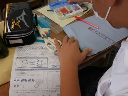 9月9日(木)3年生は家庭科でくるりんぱんだを作っています。色とりどりの糸を使い頑張って作っています。出来上がりが楽しみです。