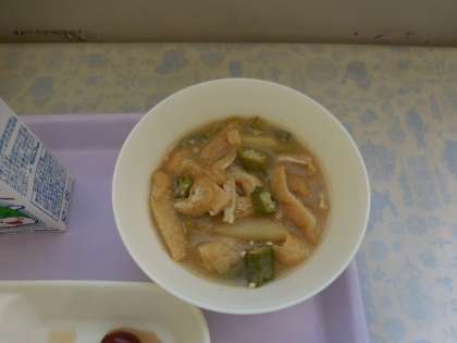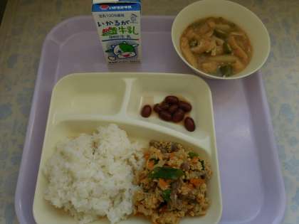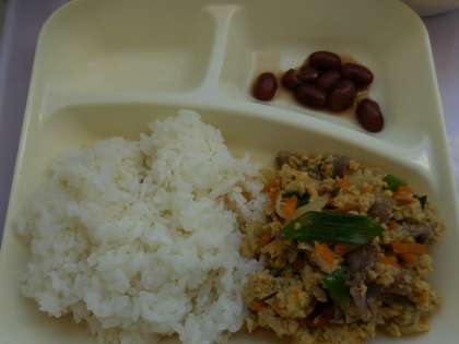 9月10日(金)の給食は他人丼、とうがんのみそ汁、金時豆の煮もの、牛乳です。他人丼は牛肉、鶏卵、たまねぎ、にんじん、青ネギが入っています。とうがんのみそ汁はうすあげ、とうがん、オクラ、が入っていて赤みそ、白みその味付です。金時豆の煮ものもほんのり甘くおいしかったです。ごちそうさまでした。