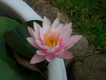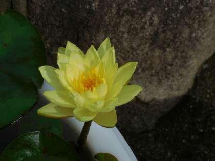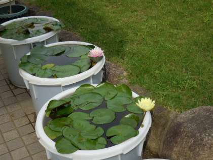 玄関に水連が黄色とピンクのきれいな花を咲かせています。