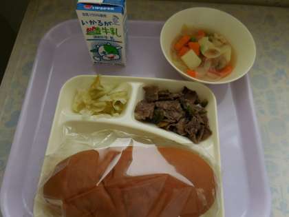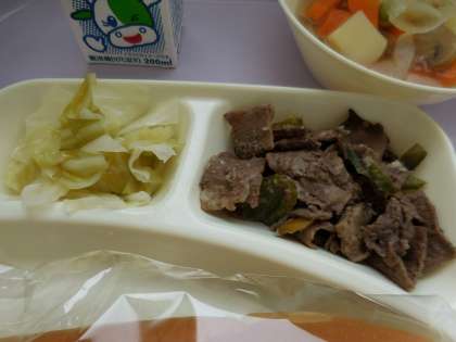 9月13日(月)の給食は牛肉の香味焼き、スープ煮、サワーキャベツ、パン、牛乳です。牛肉の香味焼きは牛肉、ピーマンをウスターソースや塩コショウで味付けしています。スープ煮は鶏肉、じゃがいも、たまねぎ、にんじん、グリンピース、マッシュルームが入っています。サワーキャベツはキャベツをうすくちしょうゆとワインビネガーで爽やかな味付けにしています。おいしかったです。ごちそうさまでした。