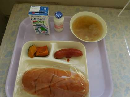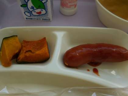 9月21日(火)の給食はフランクフルトのケッチャプソース、スープ、焼きかぼちゃ、パン、牛乳、発酵乳です。フランクフルトのケッチャプソースはケッチャプがおいしくパンによく合います。スープは鶏肉、キャベツ、たまねぎ、にんじん、パセリがはいっています。おいしかったです。ごちそうさまでした。