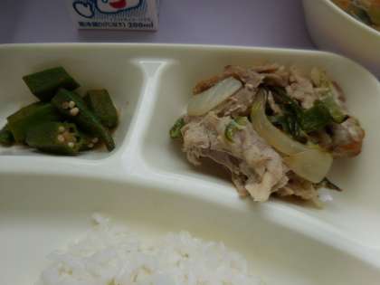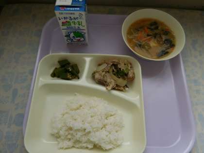 9月22日(水)の給食は豚肉の甘辛焼き、みそ汁、オクラのおかか炒め、ごはん、牛乳です。豚肉の甘辛焼きは豚肉、ピーマン、たまねぎ、を砂糖、しょうゆ、塩などで味付けして焼いています。みそ汁はさつまいも、とうふ、こまつな、にんじん、ブラックマッペもやし、えのきたけが入っています。オクラのおかか炒めはオクラをみりんや醤油で味付けしてかつおぶしをまぶしています。おいしかったです。ごちそうさまでした。