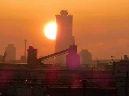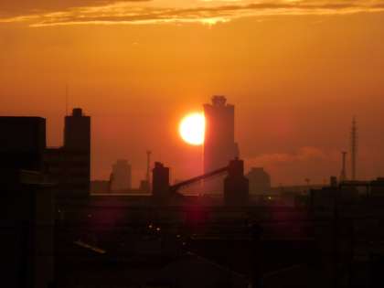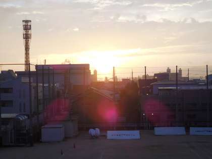 9月22日(木)きれいな夕焼けが空を茜色に染めています。雷の後の夕焼け、きれいです。校舎の4階からの景色、昨日の虹に続いての夕日。明日もいい日になる予感がします。