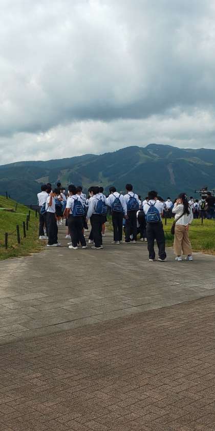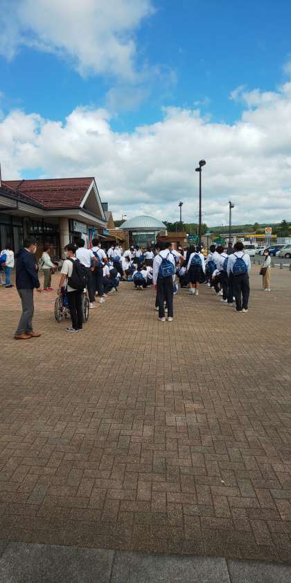 10月4日(月)ひるがの高原に到着しました。お昼ごはんです。天気は少し雲が出てきましたが良い天気です。気温は24℃、高原の爽やかな風が吹いています。子ども達は元気です。