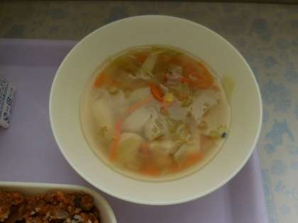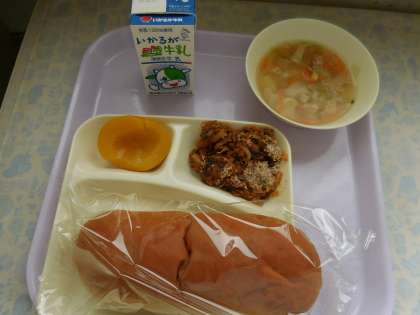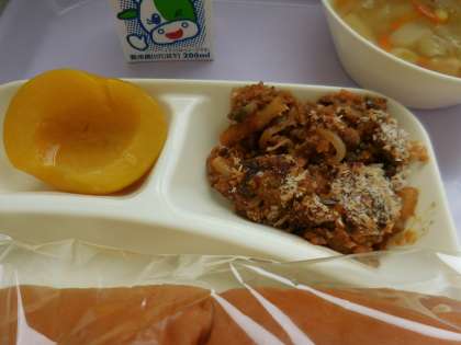 10月13日(水)の給食はなすのミートグラタン、鶏肉と野菜のスープ、黄桃、パン、牛乳です。なすのミートグラタンは牛豚ひき肉、マカロニ、なす、たまねぎ、にんにくが入っています。鶏肉と野菜のスープは鶏肉、じゃがいも、キャベツ、にんじん、コーン、パセリが入っています。おいしかったです。ごちそうさまでした。