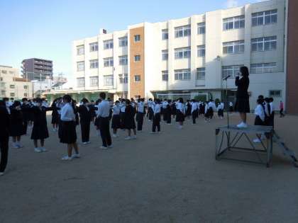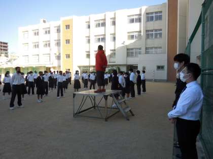 10月18日(月)昨日の日曜日からかなり冷え込んできています。今日も肌寒い朝を迎えています。そんな寒さを感じる朝ですが元気に登校しています。全校集会で教育実習の先生の紹介をしました。