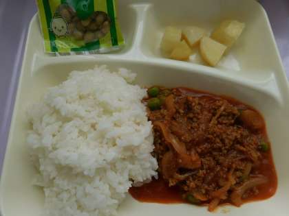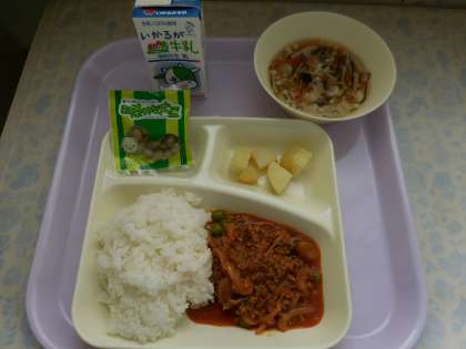 10月18日(月)の給食はタコライス、もずくのスープ、焼きじゃが、抹茶大豆、牛乳です。タコライスは牛豚ひき肉、たまねぎ、グリンピース、にんにくがはいってトマトピューレ、ケチャップ、ウスターソースで味付けしています。もずくのスープはにんじん、しろねぎ、えのきたけ、もずくが入っています。焼きじゃがはほくほくしておいしかったです。ごちそうさまでした。