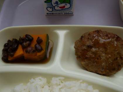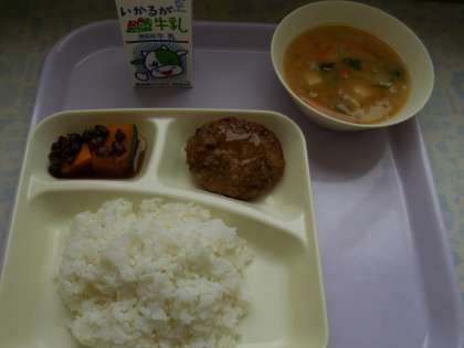 10月21日(木)の給食は和風ハンバーグ、豆腐の味噌汁、かぼちゃのいとこ煮、ごはん、牛乳です。和風ハンバーグはみりんや濃い口しょうゆ、砂糖で味付けしています。豆腐の味噌汁はとうふ、たまねぎ、はくさい、こまつな、にんじんが入って赤みそ、白みそで味付けしています。かぼちゃのいとこ煮はかぼちゃに小豆が入っています。おいしかったです。ごちそうさまでした。
