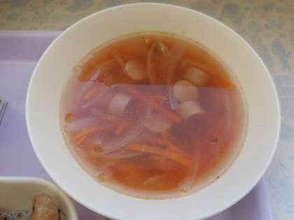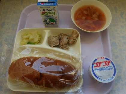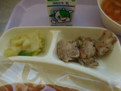10月22日(金)の給食は鶏肉の香草焼き、ウインナーとでぼ豆のスープ、キャベツのガーリックソテー、ヨーグルト、パン、牛乳です。鶏肉の香草焼きは鶏肉にワイン、バジル、オリーブオイルで下味をつけて焼いています。ウインナーとでぼ豆のスープはウインナーソーセージ、でぼ豆、たまねぎ、トマト、にんじん、パセリマッシュルーム、が入っています。キャベツのガーリックソテーはキャベツをオリーブオイルでいためにんにっくで香りを付けています。おいしかったです。ごちそうさまでした。