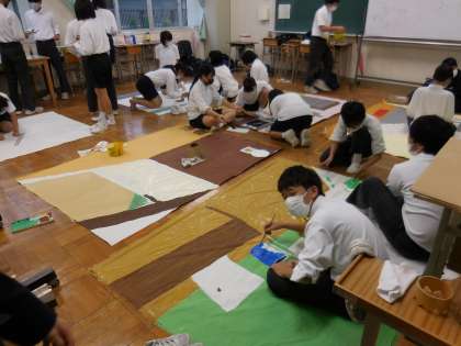 10月25日(月)3年生は劇、背景画や小道具を一所懸命作っています。役者のみなさんは多目的室で練習です。