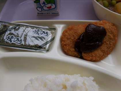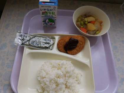 10月25日(月)の給食はみそカツ、じゃがいもと野菜の煮物、焼きのり、ごはん、牛乳です。みそカツは八丁味噌、あかみそで味付けしています。じゃがいもと野菜の煮物はじゃがいも、こんにゃく、たまねぎ、たけのこ、にんじん、むき枝豆が入っています。おいしかったです。ごちそうさまでした。