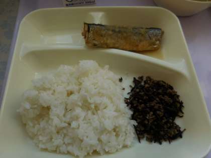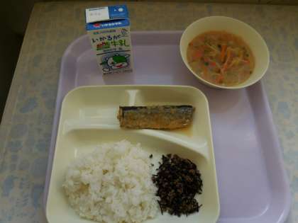 10月25日(火)の給食はさんまのみぞれかけ、みそ汁、牛ひじきそぼろ、ごはん、牛乳です。秋の味覚さんまはおろし醤油がかかっています。みそ汁ははくさい、たまねぎ、にんじん、あおねぎ、えのきたけが入っています。牛ひじきそぼろは牛ひき肉、ひじきを甘辛くご飯によく合います。おいしかったです。ごちそうさまでした。