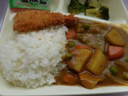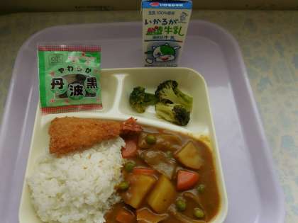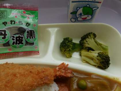 11月2日(火)の給食はエビフライカレーライス、ブロッコリーのサラダ、ソフト黒豆、牛乳です。エビフライカレーライスはエビフライ、牛肉、じゃがいも、たまねぎ、にんじん、グリンピース、にんにくが入っています。エビフライはからっと揚がっています。ブロッコリーのサラダはゆでたブロッコリーに塩や醤油であっさり味付しています。おいしかったです。ごちそうさまでした。