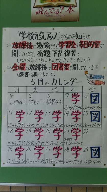 「学校元気アップ」からのお知らせです。5月の活動予定表が玄関先に掲載されています。また、予定を記したプリントも配布しています。今月は中間テストもありますので、積極的に活用してください。