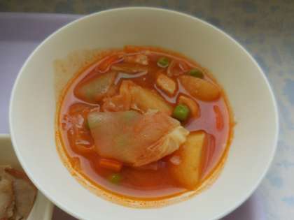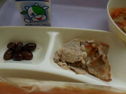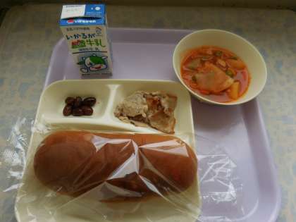 11月8日(月)の給食は豚肉のガーリック焼き、ケチャップ煮、うずら豆のグラッセ、パン、牛乳です。豚肉のガーリック焼きは豚ににんにくの香りを付けて塩コショウ、醤油などで味付けし焼いています。ケチャップ煮は鶏肉、じゃがいも、キャベツ、たまねぎ、にんじん、グリンピースが入っています。うずら豆のグラッセはほんのり甘くおいしかったです。ごちそうさまでした。