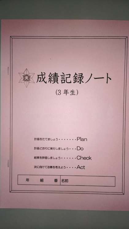 今週、全学年の生徒に「成績記録ノート」を配布します。このノートは、テスト計画や学習への取組状況、テストの反省などが書き込めるようになっています。学校では、このノートの活用について指導し、点検をおこないます。ご家庭におかれましても、ノートをご確認いただき、家庭学習のご指導をよろしくお願いいたします。