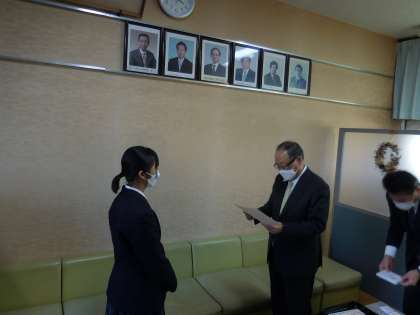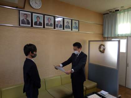 11月29日(月)校長室で西成税務署のみなさんにお越しいただき『令和3年度 中学生「税についての作文」』 表彰式を行いました。