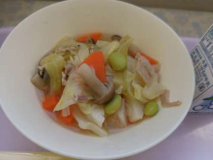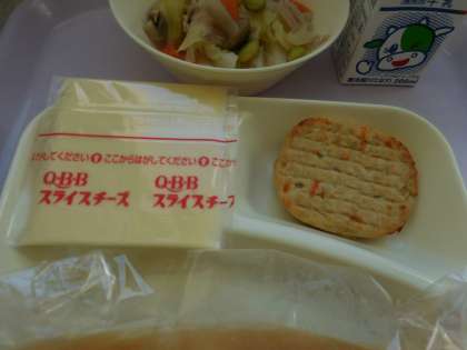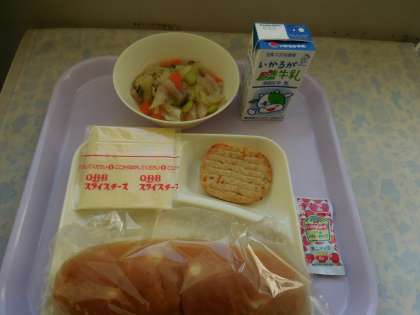 12月14日(火)の給食はとうふハンバーグ、カリフラワーのスープ煮、スライスチーズ、パン、牛乳です。とうふハンバーグはケチャップでただきます。カリフラワーのスープ煮は豚肉、キャベツ、にんじん、カリフラワー、むきえだまめ、しめじが入っています。おいしかったです。ごちそうさまでした。
