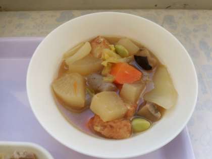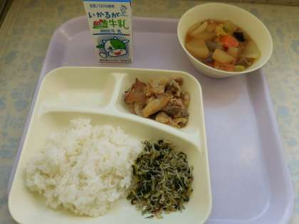 12月14日(火)の給食はじゃこ菜っ葉ごはん、豚肉のスタミナ焼き、あつあげと冬野菜のあったか煮、牛乳です。はじゃこ菜っ葉ごはんはちりめんじゃこと大根葉をみりんやしょうゆで味付けしています。豚肉のスタミナ焼きは豚肉、たまねぎ、にんにくが入っています。あつあげと冬野菜のあったか煮はあつあげ、はくさい、だいこん、にんじん、むきえだまめ、しいたけが入っています。おいしかったです。ごちそうさまでした。
