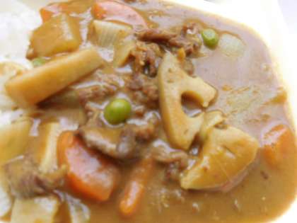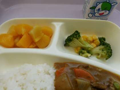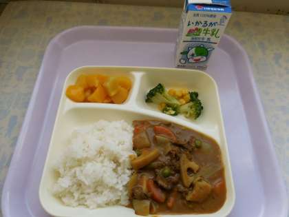 12月16日(木)の給食は冬野菜のカレーライス、ブロッコリーとコーンのサラダ、黄桃、牛乳です。冬野菜のカレーライスは牛肉、たまねぎ、にんじん、れんこん、グリンピース、しょうが、にんにくが入っています。ブロッコリーとコーンのサラダはワインビネガーやうすくちしょうゆで味付けしています。おいしかったです。ごちそうさまでした。