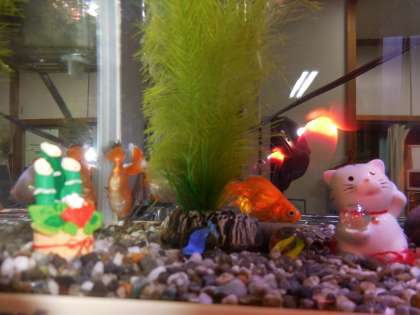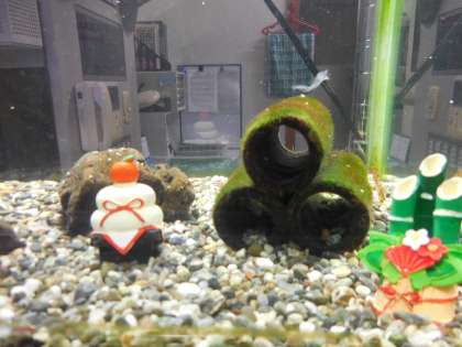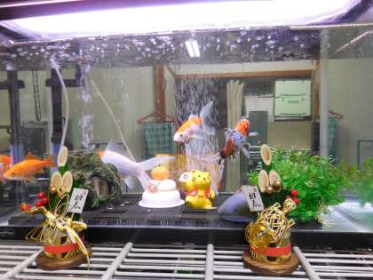 管理作業員室の金魚の水槽がお正月バージョンになっています。門松が飾られ金魚も晴れ着を着ているようです。早くみんなに会いたいなと言っているようです。