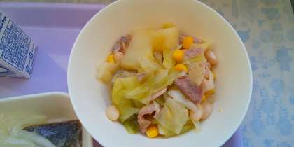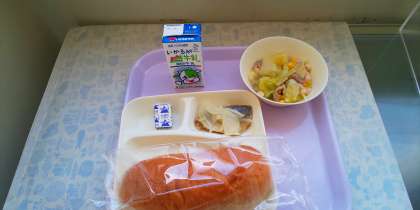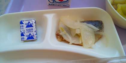 1月14日(金)の給食はあじのレモンマリネ、でぼ豆のスープ煮、固形チーズ、パン、牛乳です。あじのレモンマリネはあじにたまねぎを添えてレモン風味の爽やか味です。でぼ豆のスープはじゃがいも、でぼ豆、キャベツ、にんじん、さんどまめ、コーンが入っています。おいしかったです。ごちそうさまでした。