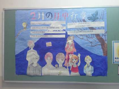 2月9日(火)階段の踊り場の掲示板に「2月の行事予定」が貼りだされました。美術部のみなさんが作ってくれました。ありがとう。