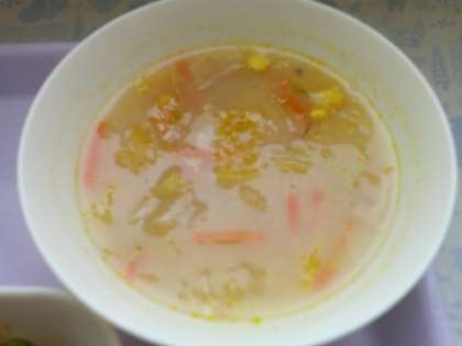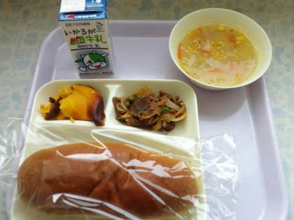 2月14日(月)の給食は牛肉のデミグラスソース煮、コーンスープ、カボチャのプリンパン、牛乳です。デミグラスソース煮は牛肉、玉ねぎ、グリンピース、ニンニクが入って赤ワインやデミグラスソース、ウスターソース、ケチャップで煮込んでいます。コーンスープはベーコン、スイートコーン、ニンジン、パセリが入っています。おいしかったです。ごちそうさまでした。