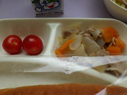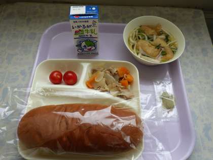 2月21日(月)の給食は豚肉と野菜の煮物、なにわうどん、プチトマト、パン、牛乳です。豚肉と野菜の煮物は豚肉、たまねぎ、にんじん、が入っています。なにわうどんはかまぼこ、うどん、うすあげ、はくさい、青ネギ、が入っています。おいしかったです。ごちそうさまでした。
