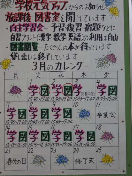 3月2日(火)玄関に元気アップカレンダーが貼り出されています。