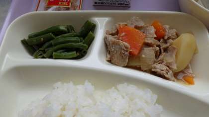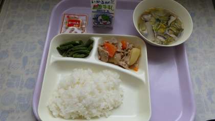 3月7日(月)の給食は変わり肉じゃが、鶏肉と白菜のすまし汁、さんどまめのごま和え、ごはん、牛乳です。変わり肉じゃがは豚肉、じゃがいも、たまねぎ、にんじんを赤みそやしょうゆ、砂糖で味付けしています。鶏肉と白菜のすまし汁は鶏肉、はくさい、だいこん、みつば、しいたけが入っています。さんどまめのごま和えはさんど豆をねりごまやさとう、醤油で和えています。おいしかったです。ごちそうさまでした。