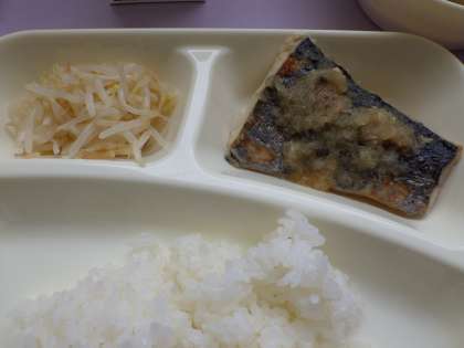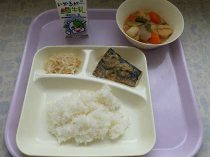 3月9日(水)の給食はさごしのおろしじょうゆかけ、一口がんもと里芋の味噌煮、もやしのゆずの香和え、ごはん、牛乳です。さごしのおろしじょうゆかけは焼いたさごしにおろし醤油でで味付けした大根おろしをかけています。一口がんもと里芋の味噌煮は鶏肉、つなこんにゃく、さといも、一口がんも、たまねぎ、にんじん、さんど豆が入っています。もやしのゆずの香和えはブラックマッペもやしにあっさり味付けしゆずのかおりがします。おいしかったです。ごちそうさまでした。