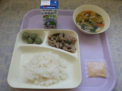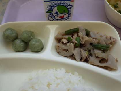 3月16日(水)の給食は豚肉とレンコンの炒め煮、五目汁、きな粉よもぎだんご、ごはん、牛乳です。豚肉とレンコンの炒め煮は豚肉、れんこん、さんどまめが入っています。五目汁は鶏肉、かまぼこ、たまねぎ、はくさい、にんじん、みつば、しいたけが入っています。きな粉よもぎだんごはほんのりと甘くおいしかったです。ごちそうさまでした。