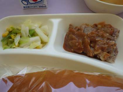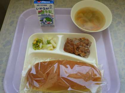 4月12日(火)の給食は豚肉のデミグラスソース、スープ、キャベツとコーンのソテェー、パン、牛乳です。豚肉のデミグラスソースは豚肉にデミグラスソース、ケチャップ、ウスターソースなどで味付けしています。スープは鶏肉、じゃがいも、たまねぎ、にんじん、グリンピースが入っています。キャベツとコーンのソテェーはキャベツとコーンを塩おコショウで味付けしたあっさり味です。おいしかったです。ごちそうさまでした。