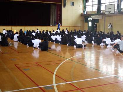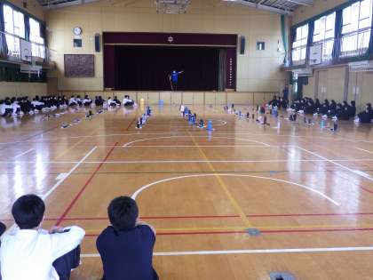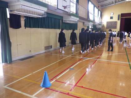 4月15日(木)宿泊オリエンテェーション体育館での活動の様子です。給食を食べて出発します。