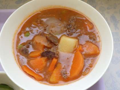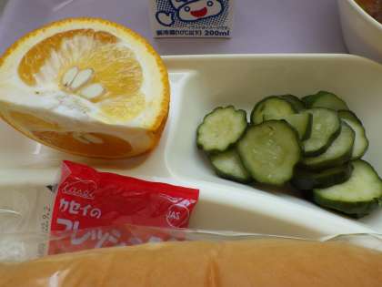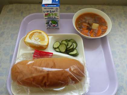 4月19日(火)の給食はビーフシチュー、きゅうりのサラダ、あまなつかん、パン、牛乳です。ビーフシチューは牛肉、じゃがいも、たまねぎ、にんじん、グリンピースが入っています。きゅうりのサラダはあっさり味です。おいしかったです。ごちそうさまでした。