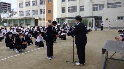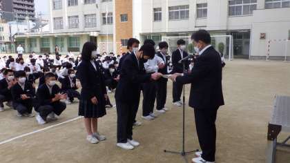 5月10日(火)認証式で代表として3年1組の学級役員のみなさんに認証場を渡しました。各クラス担任の先生から認証場が渡されました。よろしくお願いします。また、区長さんから読書賞をいただきました。おめでとう。